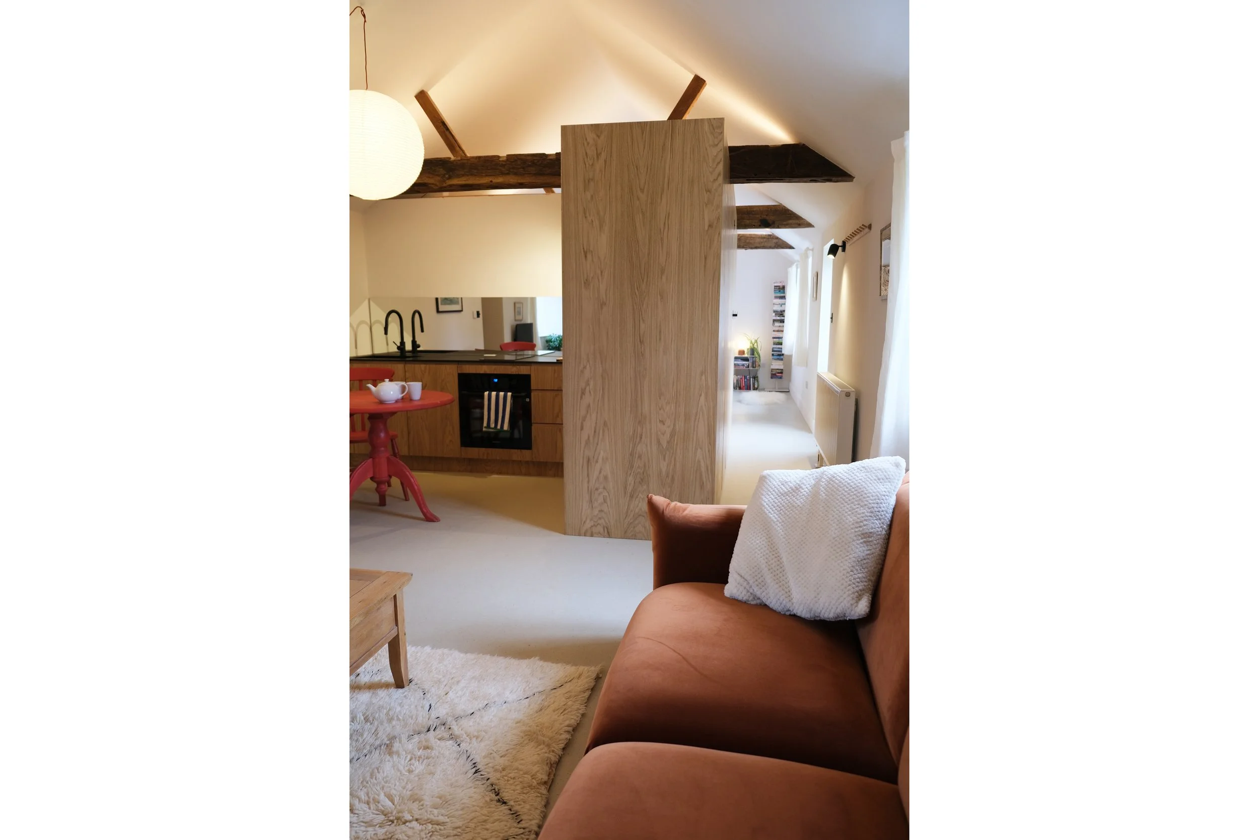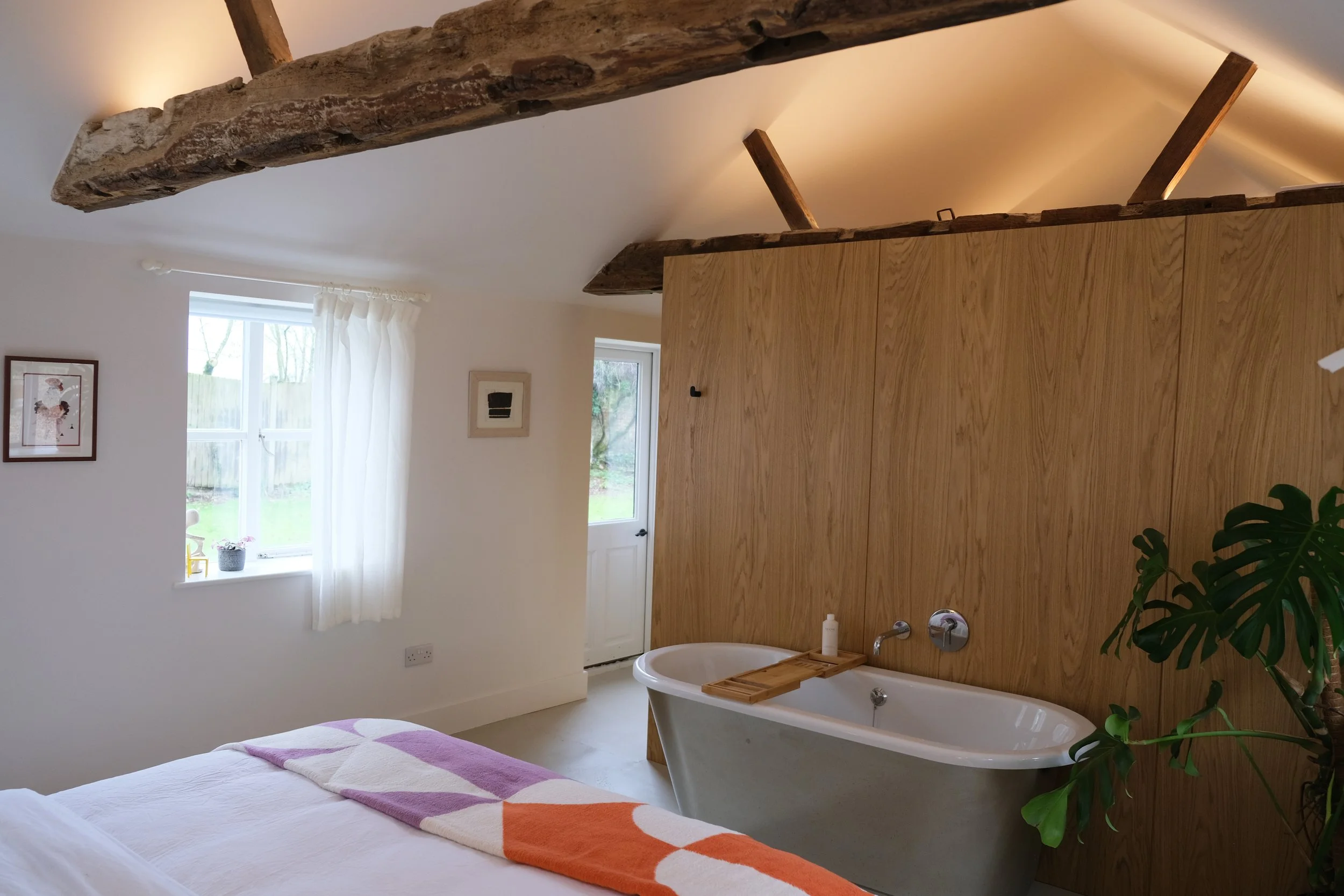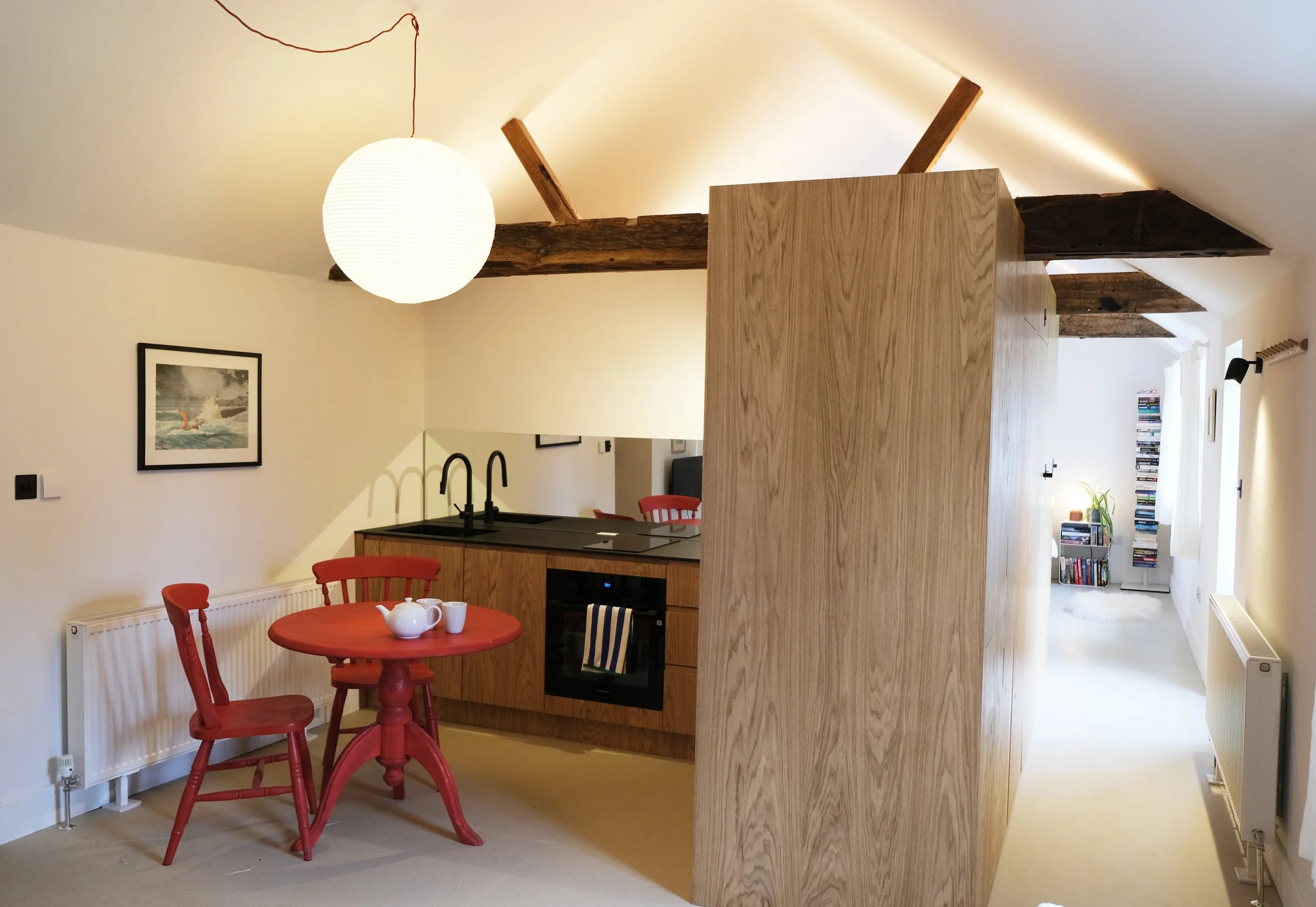 Conversion of an existing Outbuilding into a 1 bedrooom holiday cottage. Using natural oak panelling to reference the surrounding landscape. A collection of artwork by local artists and a full library of reference books and novels ensures a creative and restfull escape with outlooks to a large private garden and Sparrow Green Farm grounds,. Bookings via Cottages.com